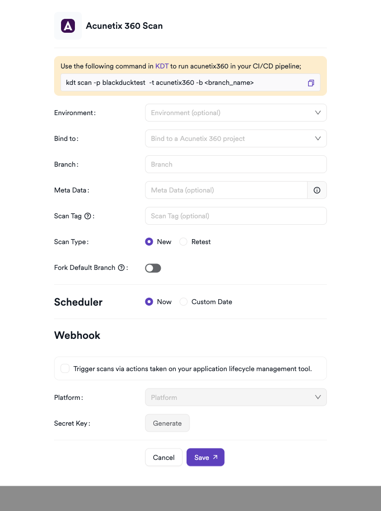 kdt scan -p <project_name> -t acunetix360 -b <branch_name>