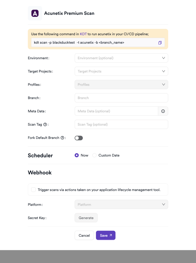 kdt scan -p <project_name> -t acunetix -b <branch_name>
