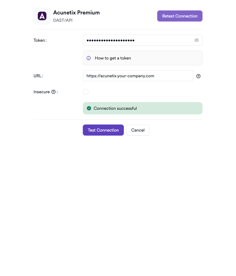 https://acunetix.your-company.com). - Insecure: Enable this checkbox only if your Acunetix Premium instance uses a self-signed SSL certificate.