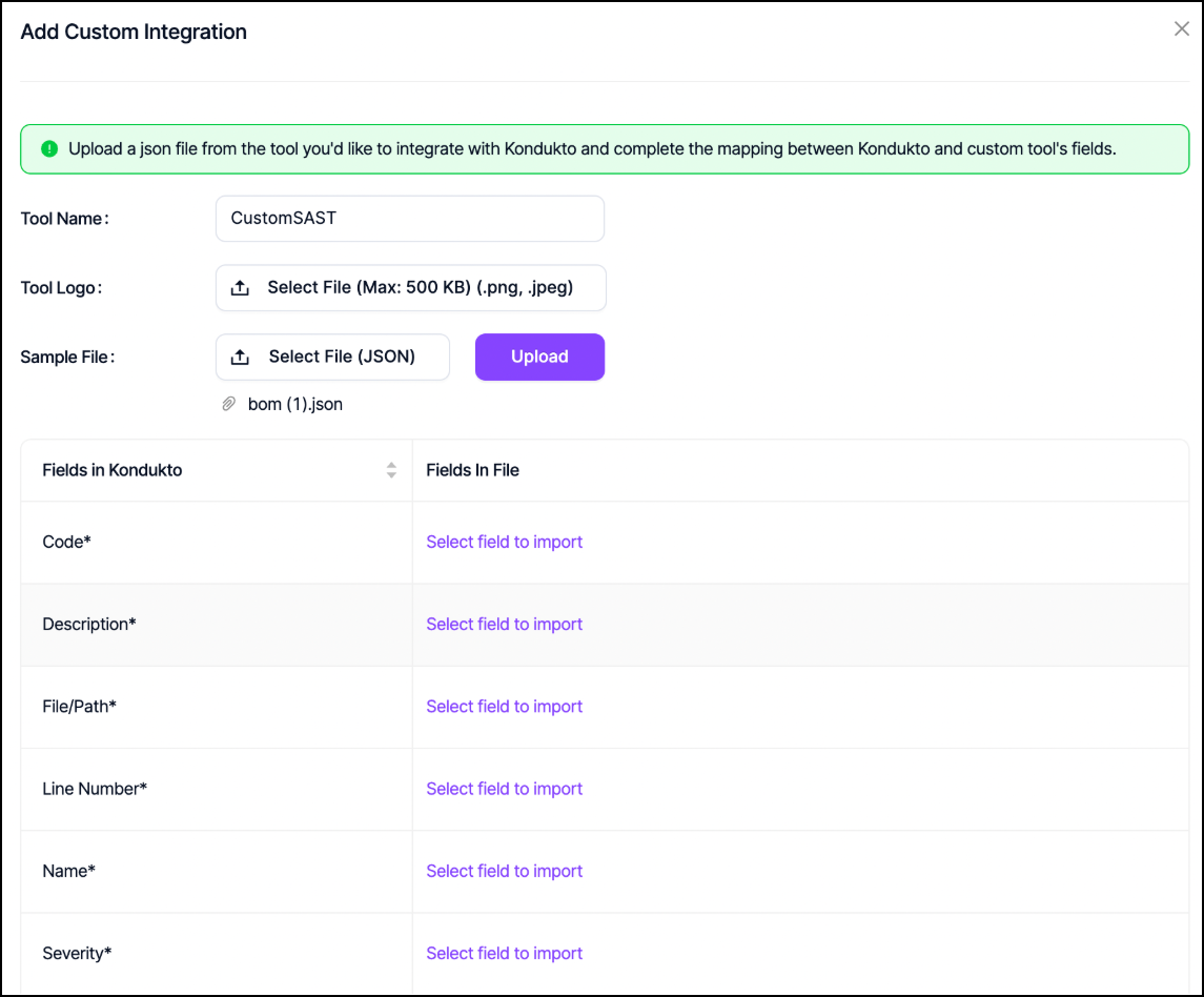 Upload a JSON file extracted from the custom tool to Invicti AppSec. This file is used to complete the mapping between Invicti AppSec fields and fields available on the custom tool.