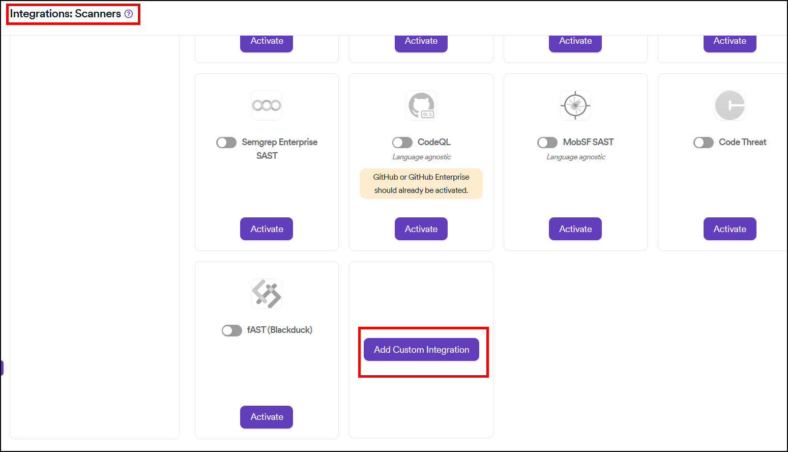 Custom integration capability is currently available for SAST, SCA, Container Security (CS), and Infrastructure as Code (IAC) scanner categories.