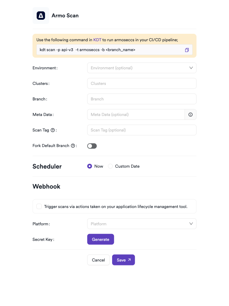 kdt scan -p <project_name> -t armoseccs -b <branch_name>