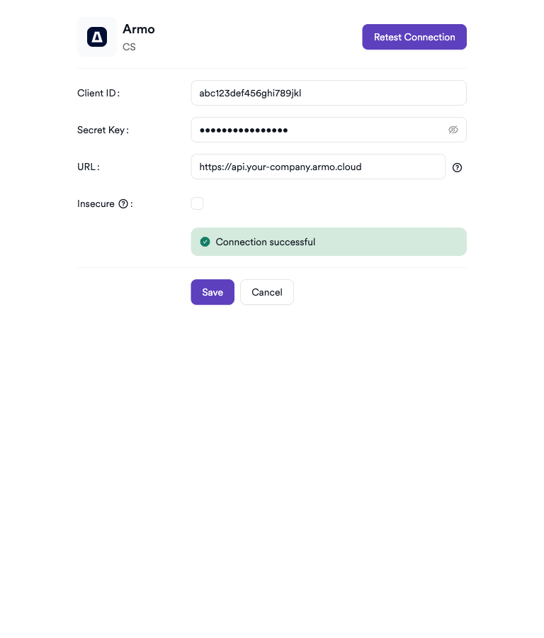 | Client ID | OAuth2 Client ID from the Armo platform | Yes |