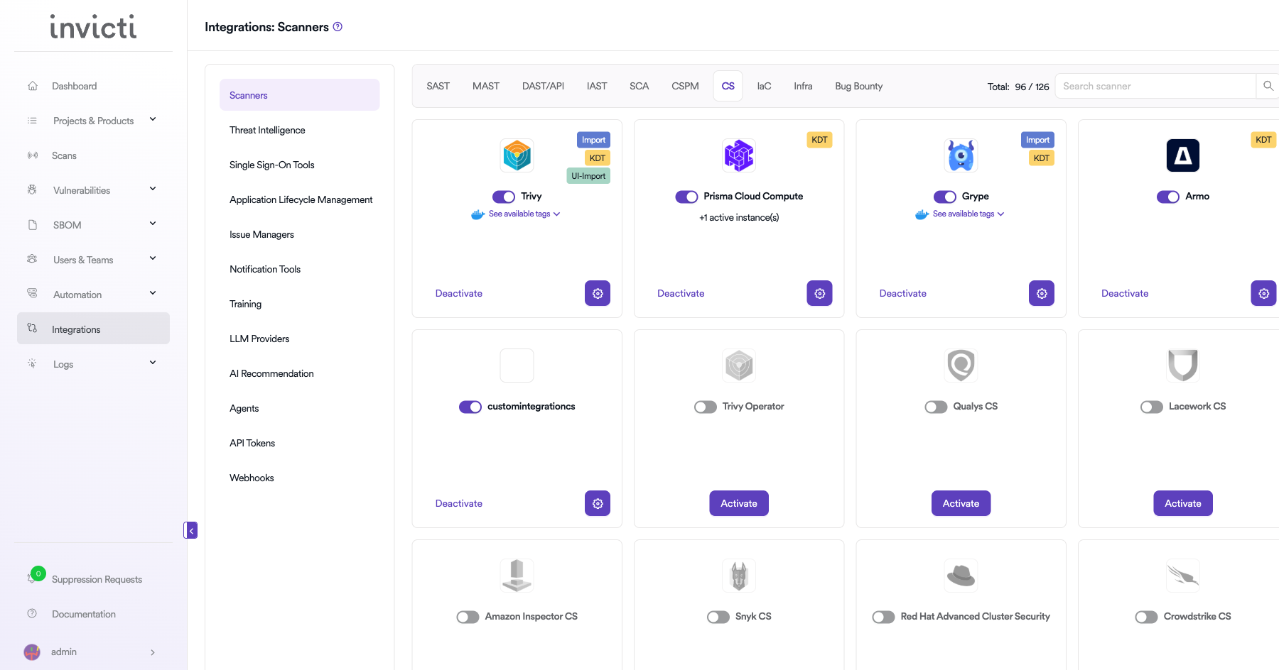 On the Integrations > Scanners page, click on the CS tab.