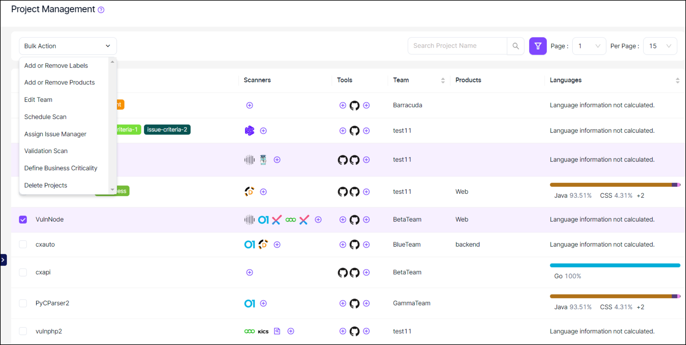 It's also possible to filter the table by project, labels, team, language, product, and business critic in the search section available at the top.