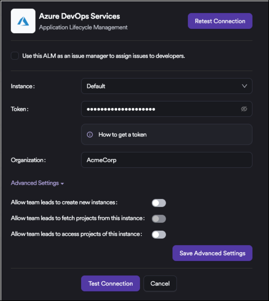 Under Advanced Settings, you can configure options for Azure DevOps Services. When enabled, these settings grant permissions to Team Leads as well as Administrators, allowing Team Leads to add their own organizations, onboard projects, and manage access independently.