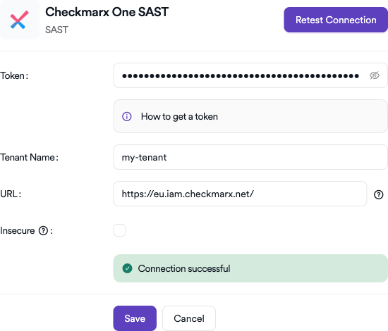 https://eu.iam.checkmarx.net/for EU,https://nam.iam.checkmarx.net/for North America). - SSL Certificate Issues: If using a self-hosted instance, enable the Insecure checkbox for self-signed certificates.