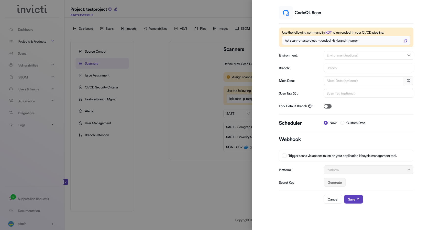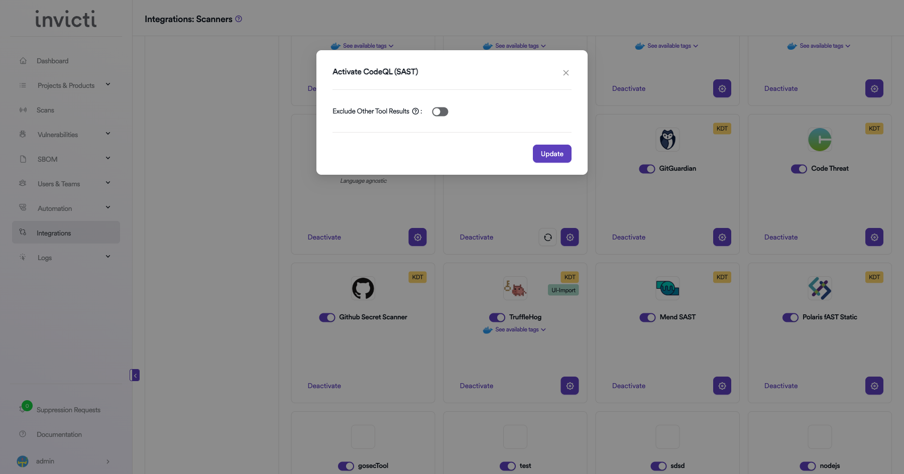 Invicti Appsec supports CodeQL as a SAST (Static Application Security Testing) scanner. This guide explains how to activate and configure the CodeQL integration.