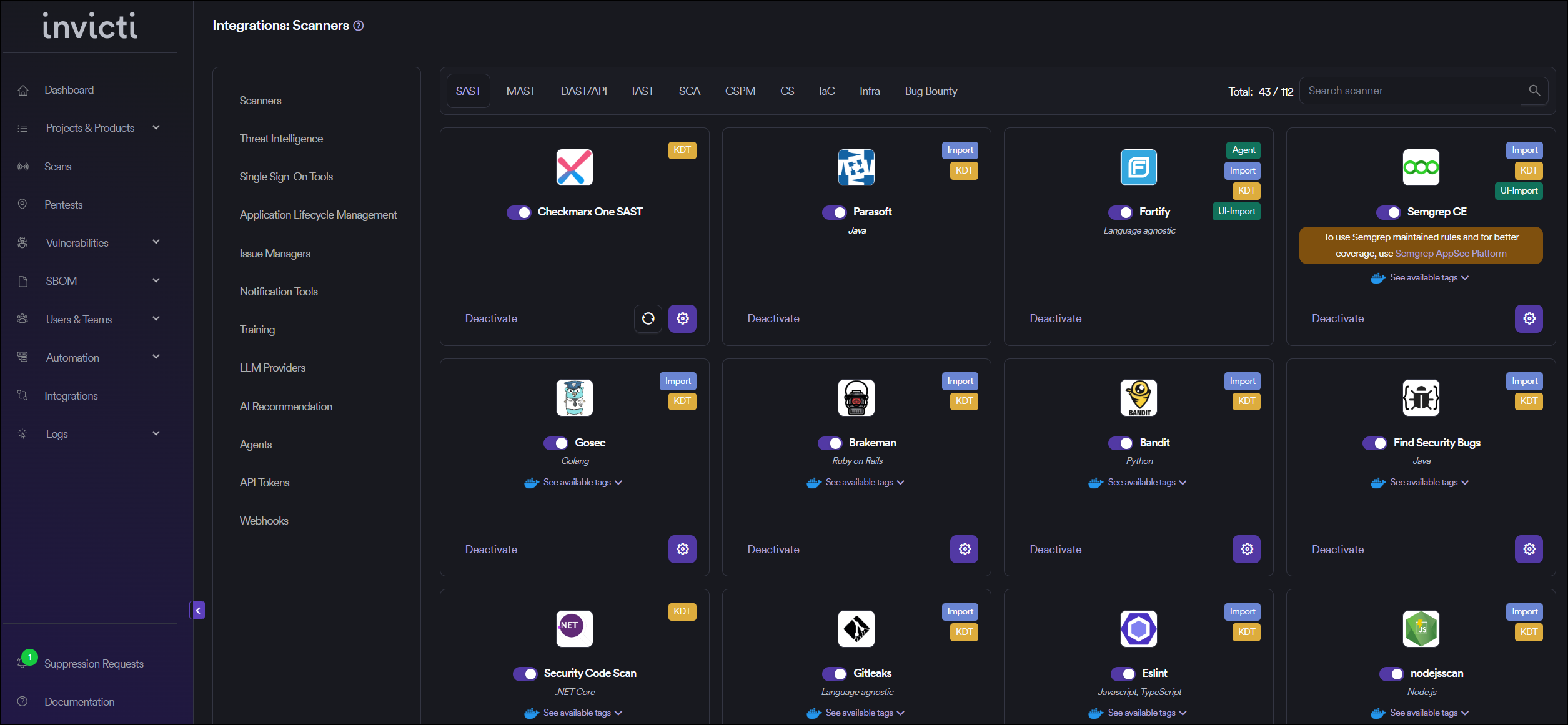 On the Integrations page, you will see the Scanners section with multiple tabs. Click on the SAST tab (it is selected by default).