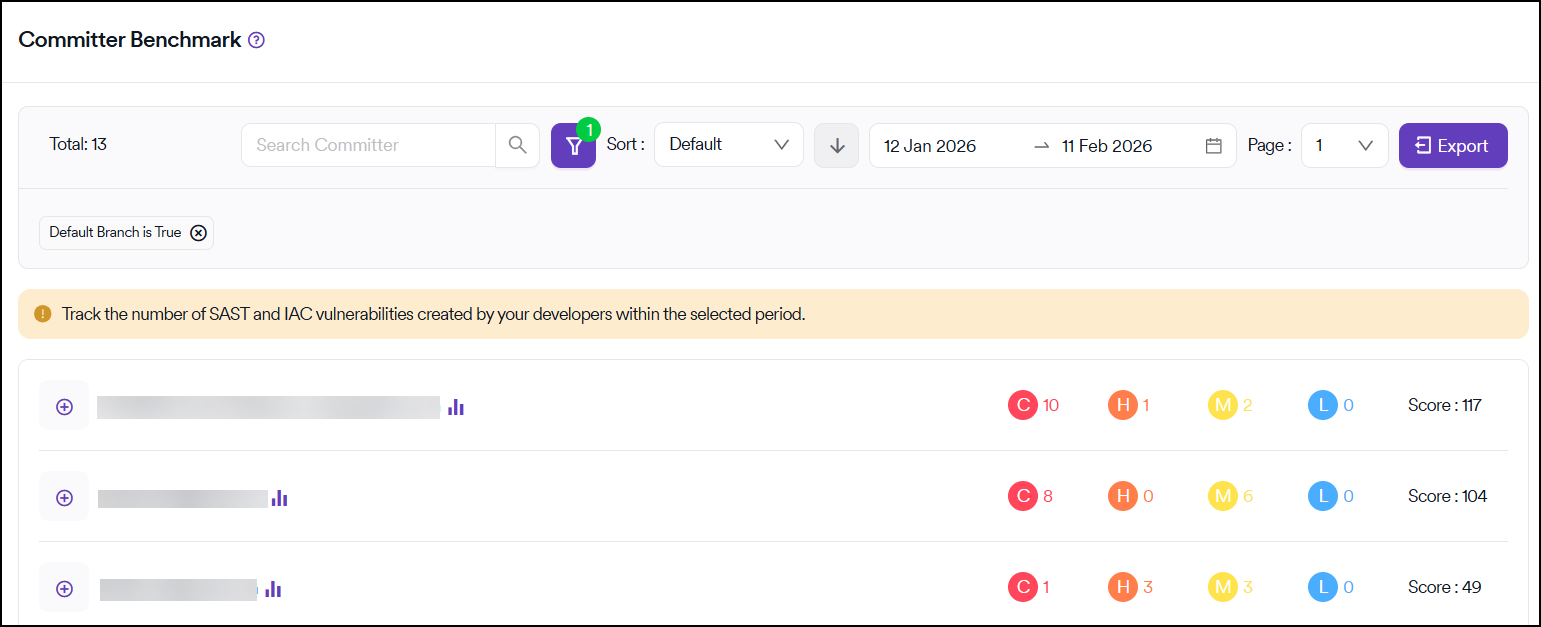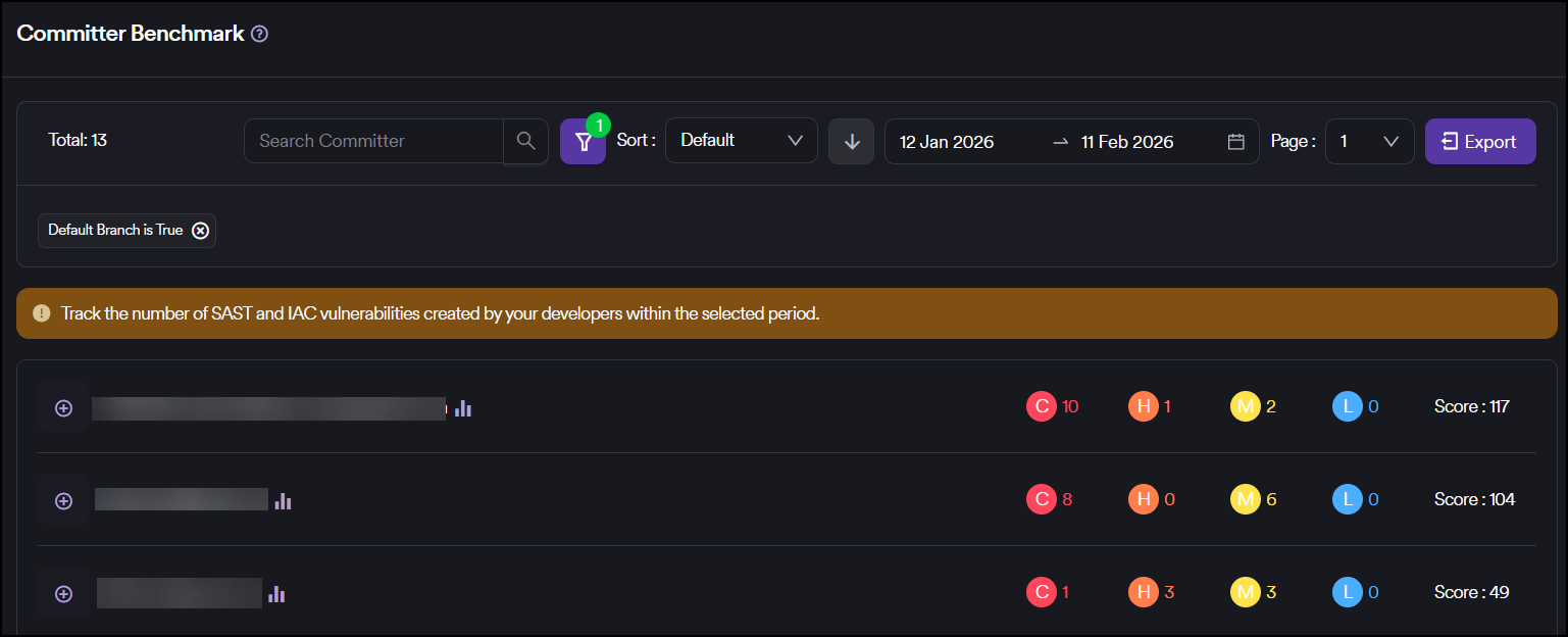This screen allows you to track vulnerabilities created by each developer within a selected period, with closed vulnerabilities being excluded from this view. The score found on the rightmost side of each committer row is computed in a manner similar to the risk score.