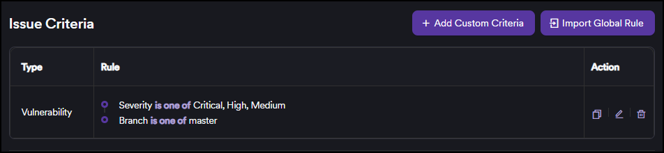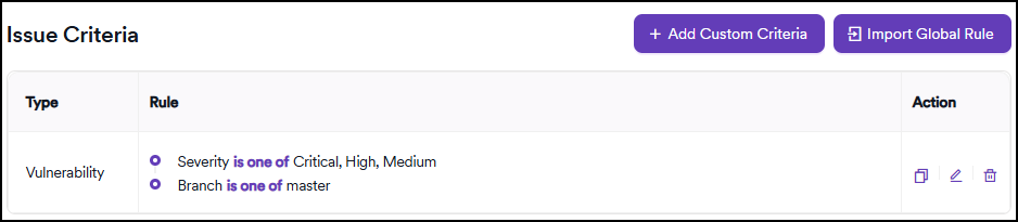 The saved rule appears in the issue criteria table. From here, you can edit (pencil icon), delete (trash bin icon), or duplicate (copy icon) the rule.