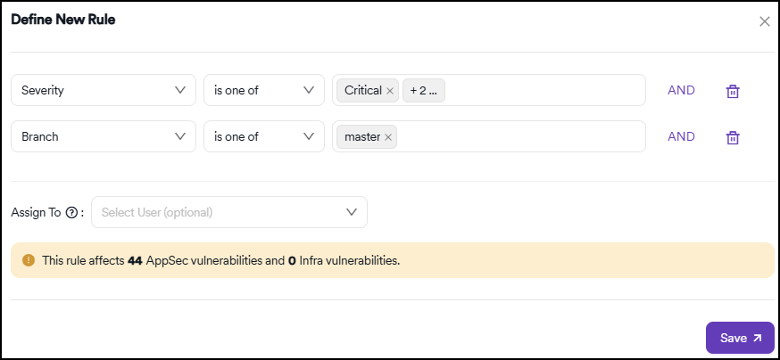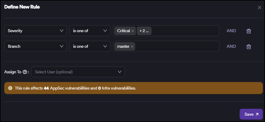 Use combined conditions to target specific vulnerability types. For example, you can create criteria that open issues only for vulnerabilities discovered in the default branch by a specific scanner that fall into certain OWASP categories with high and critical severity.