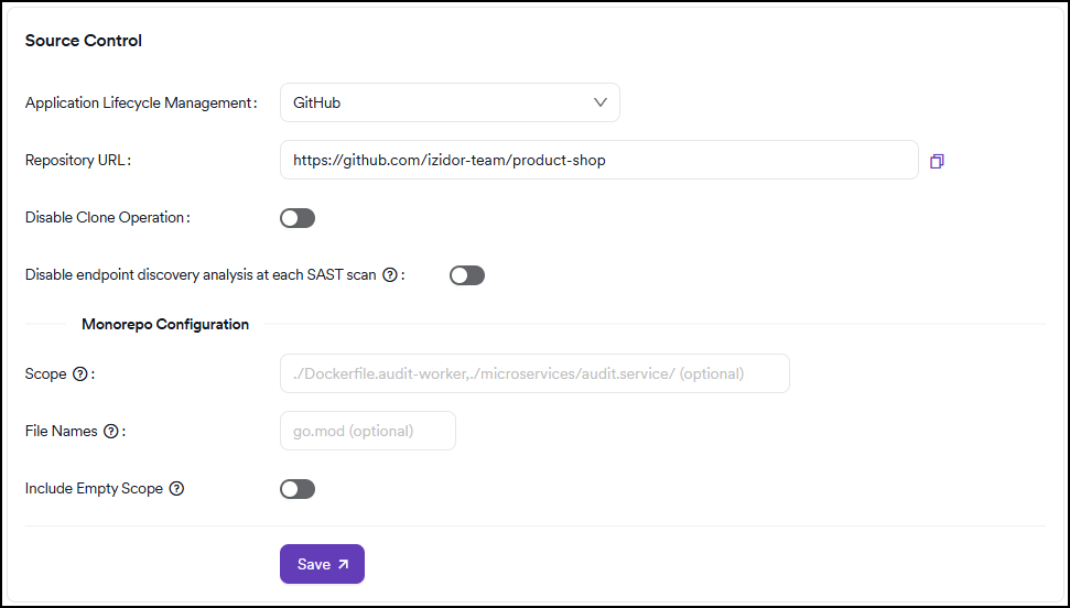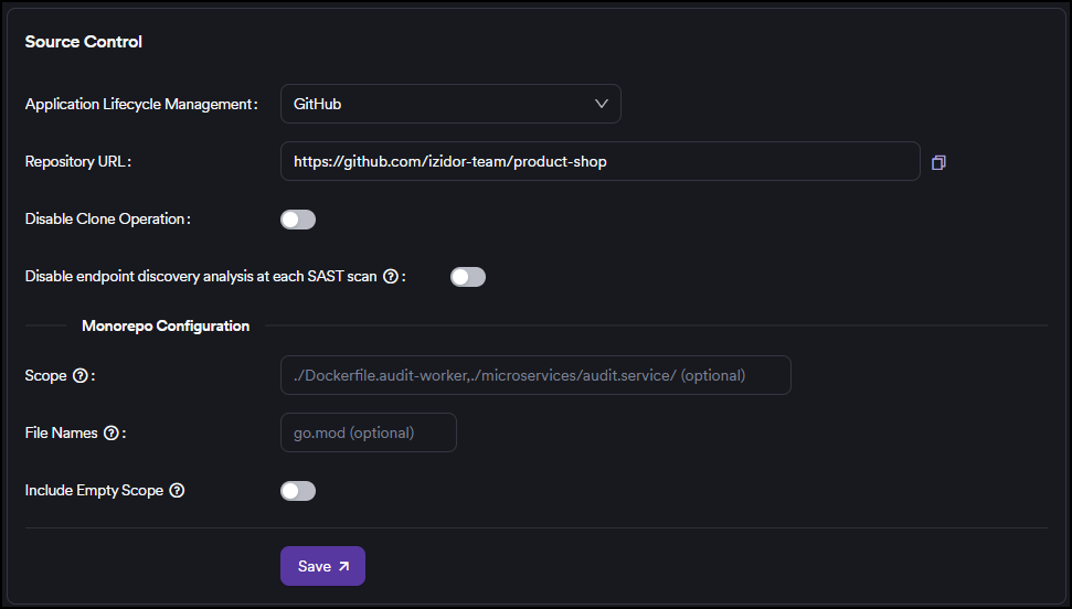 Source control configuration connects your project to its repository, enabling Invicti AppSec to retrieve code information, analyze endpoints, and correlate findings between SAST and DAST scans. This integration provides valuable context for vulnerability analysis and helps track code changes.