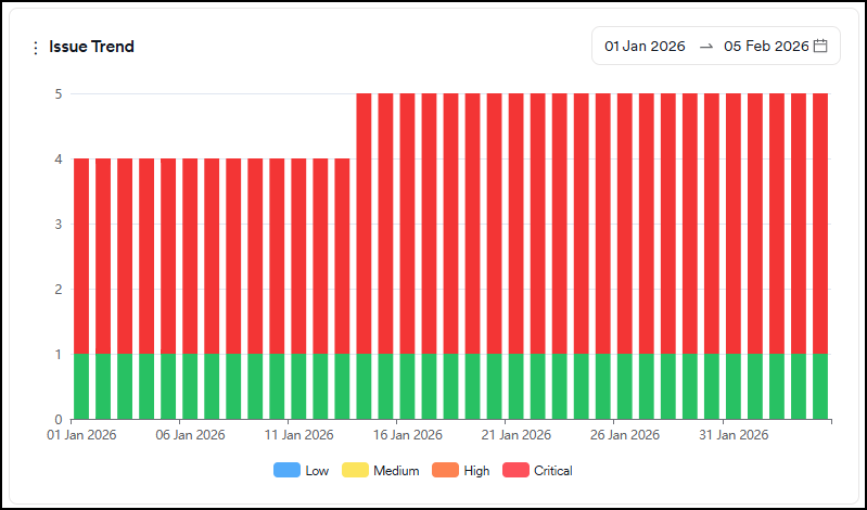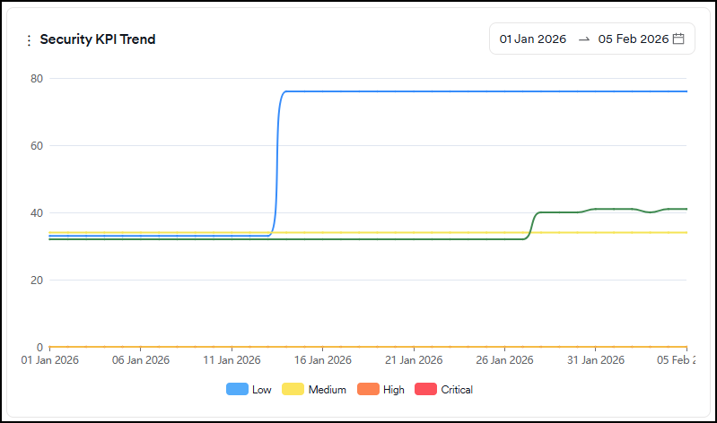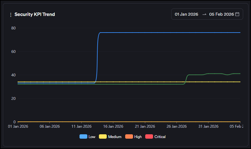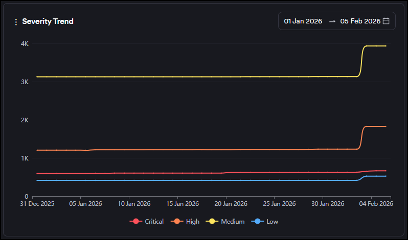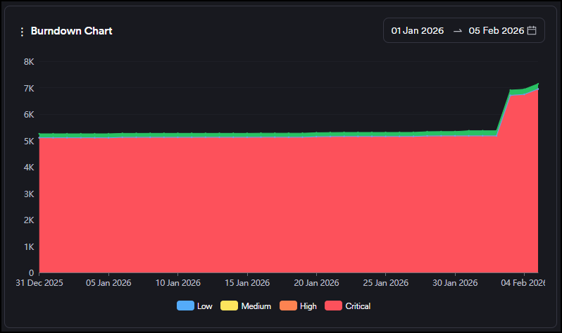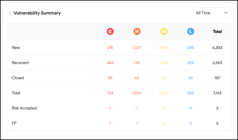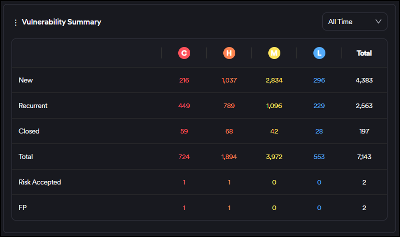 - False Positive: Vulnerabilities discovered in a scan but marked as "false positive" by the user or the scanner. These vulnerabilities are instantly excluded from all charts and metrics.