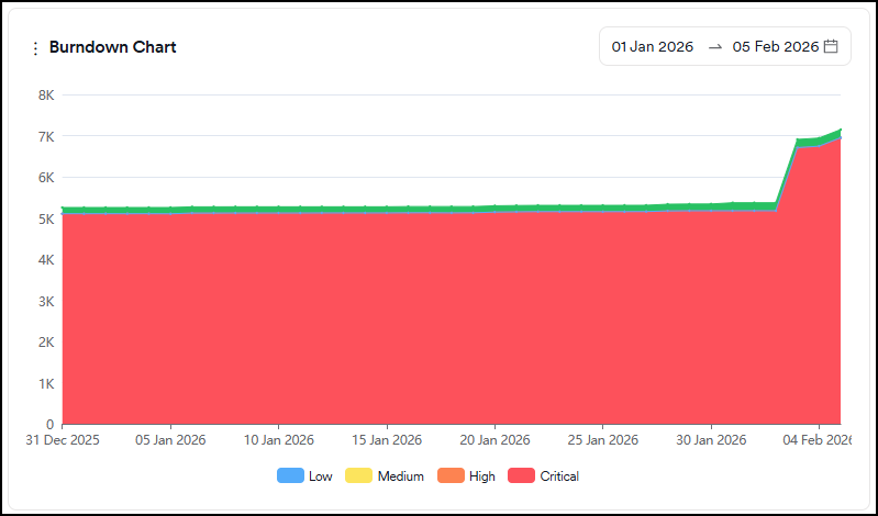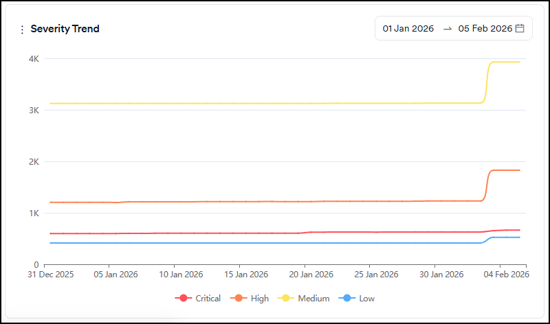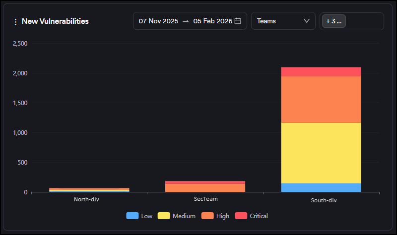 - Time to remediate: Shows how long it takes to close vulnerabilities on average (Last Seen Date-First Seen Date)