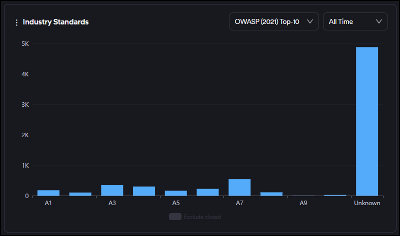 This graph displays the distribution of all vulnerabilities based on OWASP Top 10, PCI, and NIST categories.