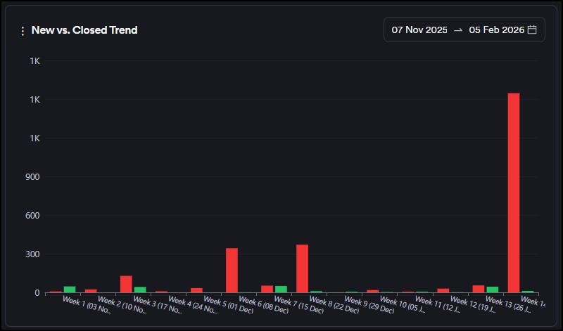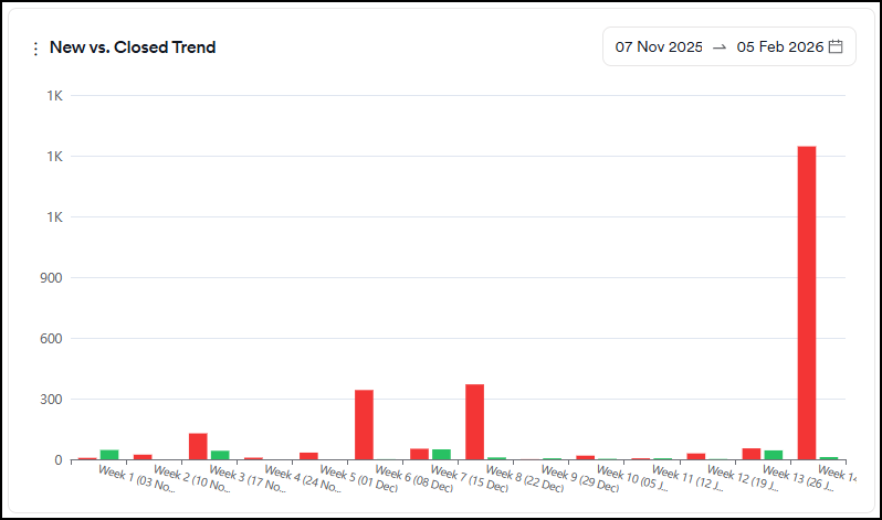 The graph shows new vulnerabilities discovered for the first time as an increase on the y-axis, and closed vulnerabilities as a decrease on the y-axis. You can track whether there are more new or closed vulnerabilities within the selected period.