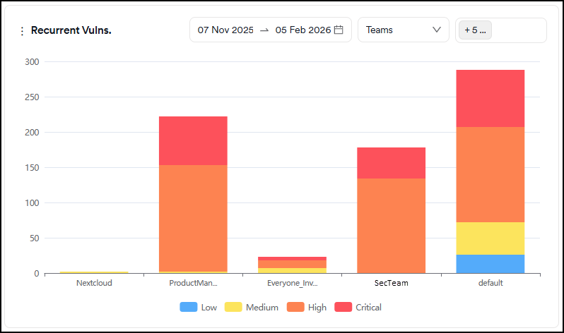 This graph shows the number of new and recurrent vulnerabilities in projects assigned to selected teams.