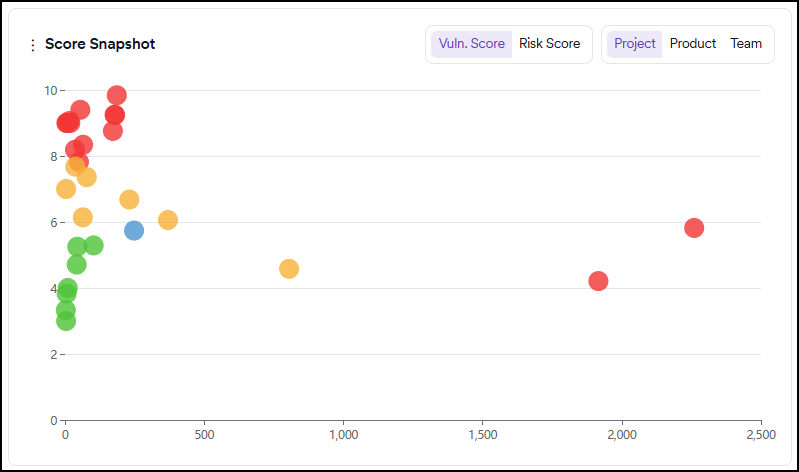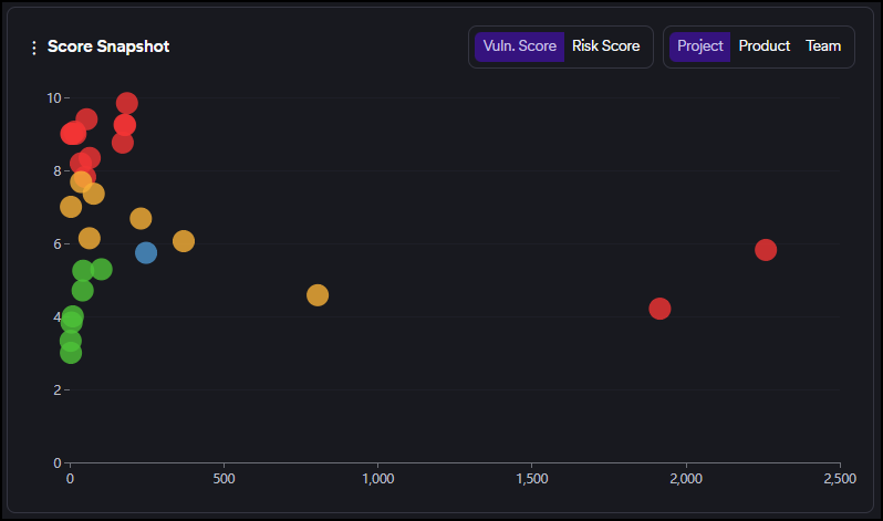 This graph shows the risk/vulnerability score (Y-axis) and the number of vulnerabilities (X-axis) of each project/team based on the risk score calculated by the number of new and recurrent vulnerabilities.