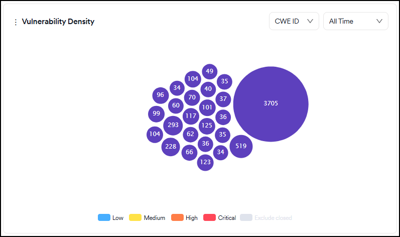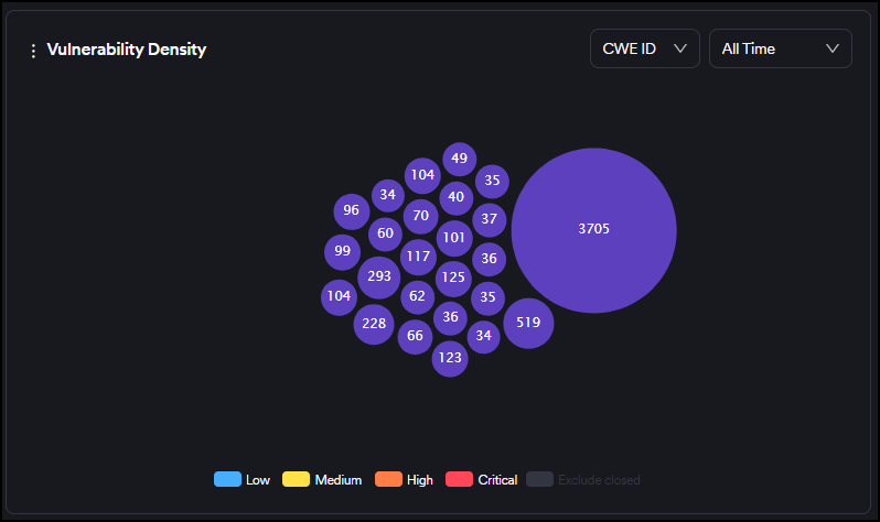 The bigger the circle of a vulnerability is, the more times it has been discovered by scanners. The numbers on the other ones indicate the number of vulnerabilities falling under the same CWE ID, the endpoint, or the file/path.