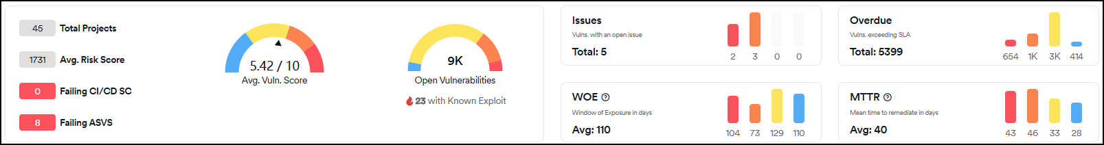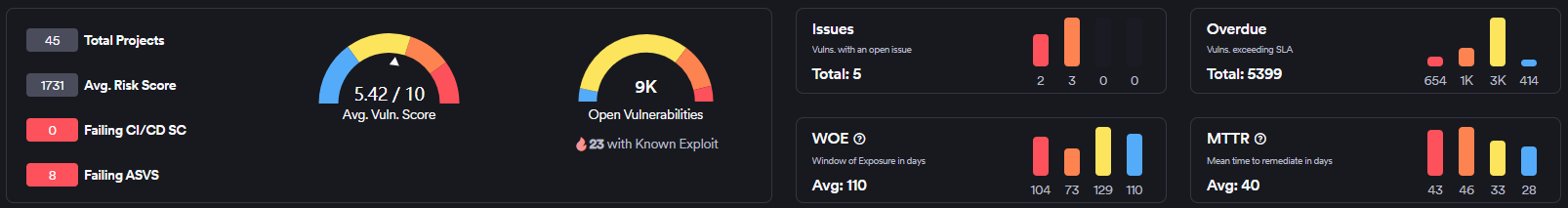 Shows the average time required to remediate closed vulnerabilities, measured in days. Displays the average (40 days in the example shown) with distribution metrics. For vulnerabilities that are rediscovered after closure, the system calculates Window of Exposure (WOE) instead of MTTR.