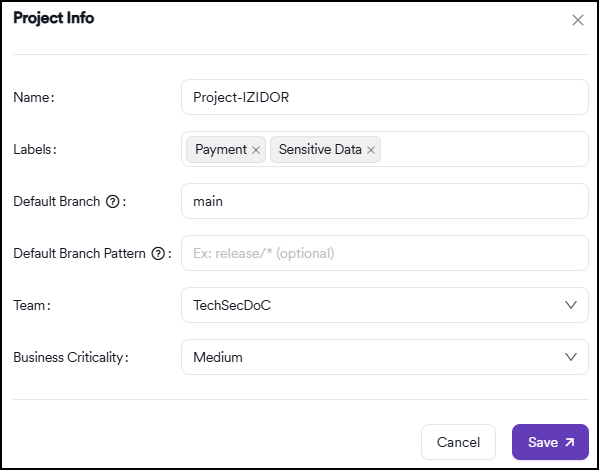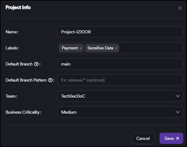 After creating a project, you might need to update its configuration as your requirements evolve. You can easily modify project settings including the name, labels, branch configuration, team assignments, and business criticality level.