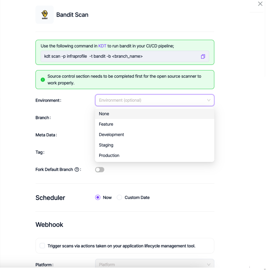 The Environment field (optional) under scan parameters works both on the UI and CLI as an optional field. The values of this field can be one of: