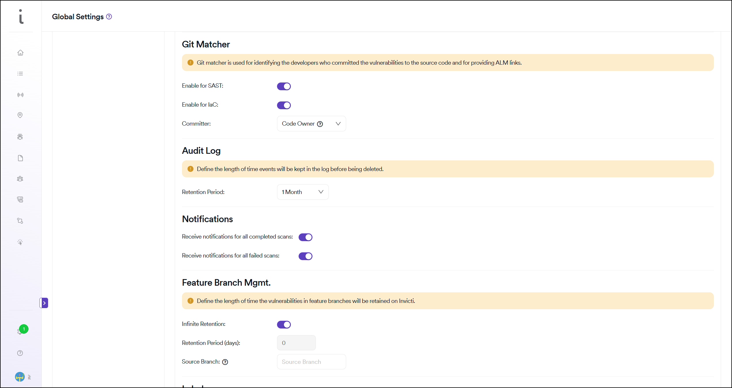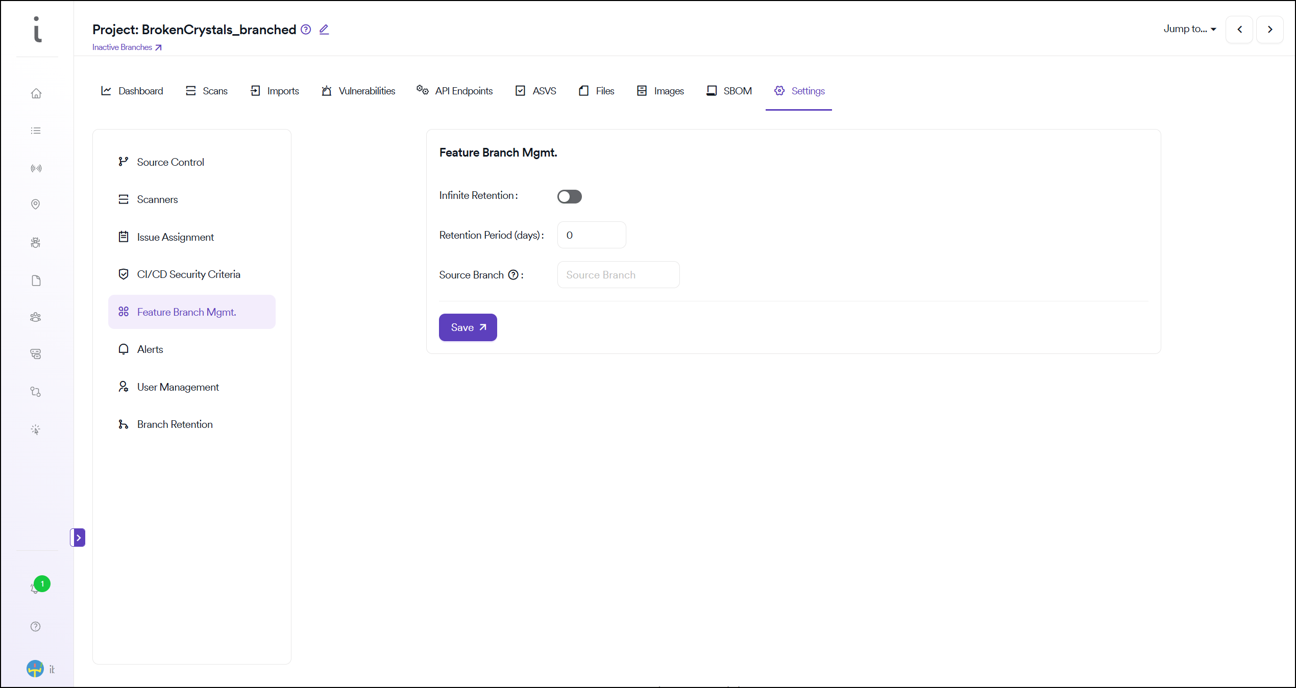 Vulnerabilities belonging to the Feature environment are deleted automatically in the frequency set by the user under the Feature Branch Management setting. This setting is available under global settings and can be overridden under project settings. Invicti AppSec checks for the last scan date of the relevant branch (regardless of the scanner) to decide if the vulnerabilities should be deleted or retained.