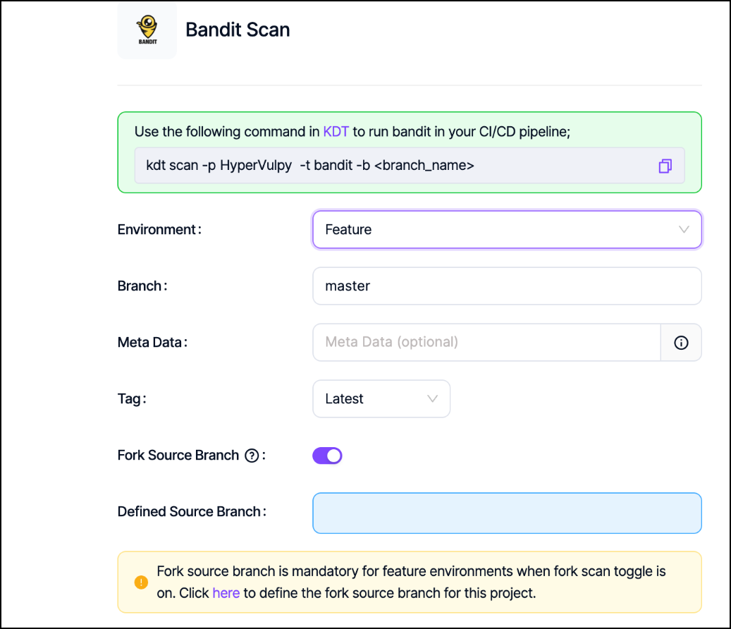 Fork scan is enabled by default for scans where Feature is selected as an environment. Since fork scans require a source branch, if there's no source branch defined on a global or project level, a warning pops up on the UI saying that "Fork source branch is mandatory for feature environments when fork source branch toggle is on. Click here to define the fork source branch for this project."