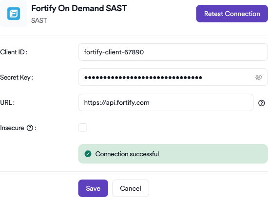 https://api.ams.fortify.com). - Insecure: Enable this checkbox only if your Fortify On Demand instance uses a self-signed SSL certificate.