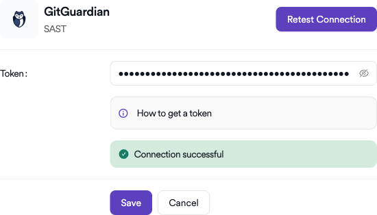 - Token: Paste the personal access token you generated from GitGuardian.