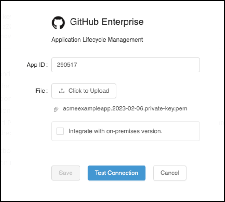 - Enter the App ID and PEM key. If you use GitHub Enterprise On-premises, select Integrate with On-premises version.