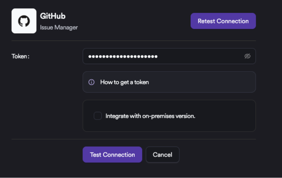 At this step, entering the token and clicking Test Connection is sufficient. If GitHub is running on-premises, the corresponding checkbox should be selected and the GitHub URL should be provided.