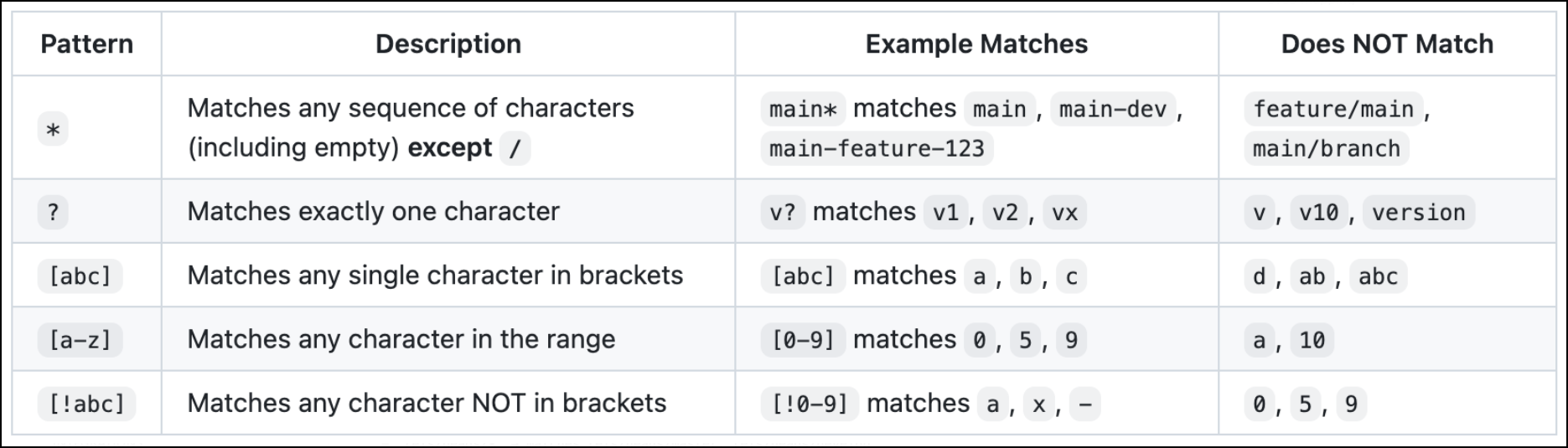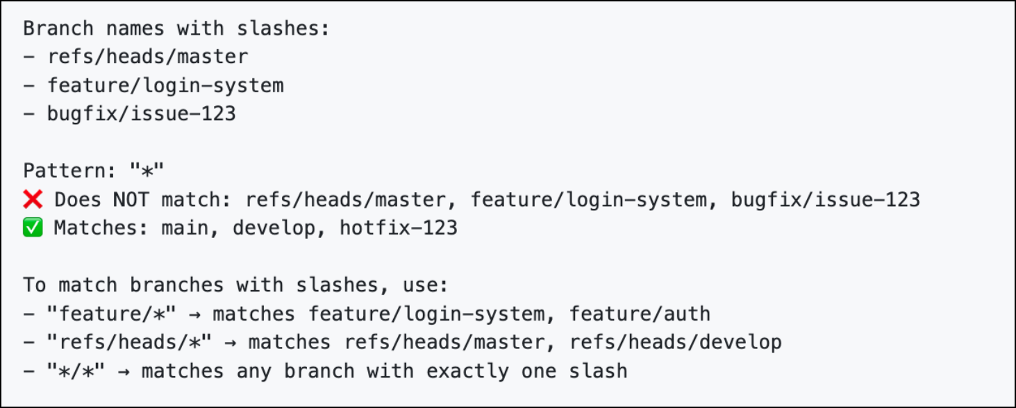 The * wildcard does NOT match the forward slash (/) character. This is important for branch names that contain slashes.