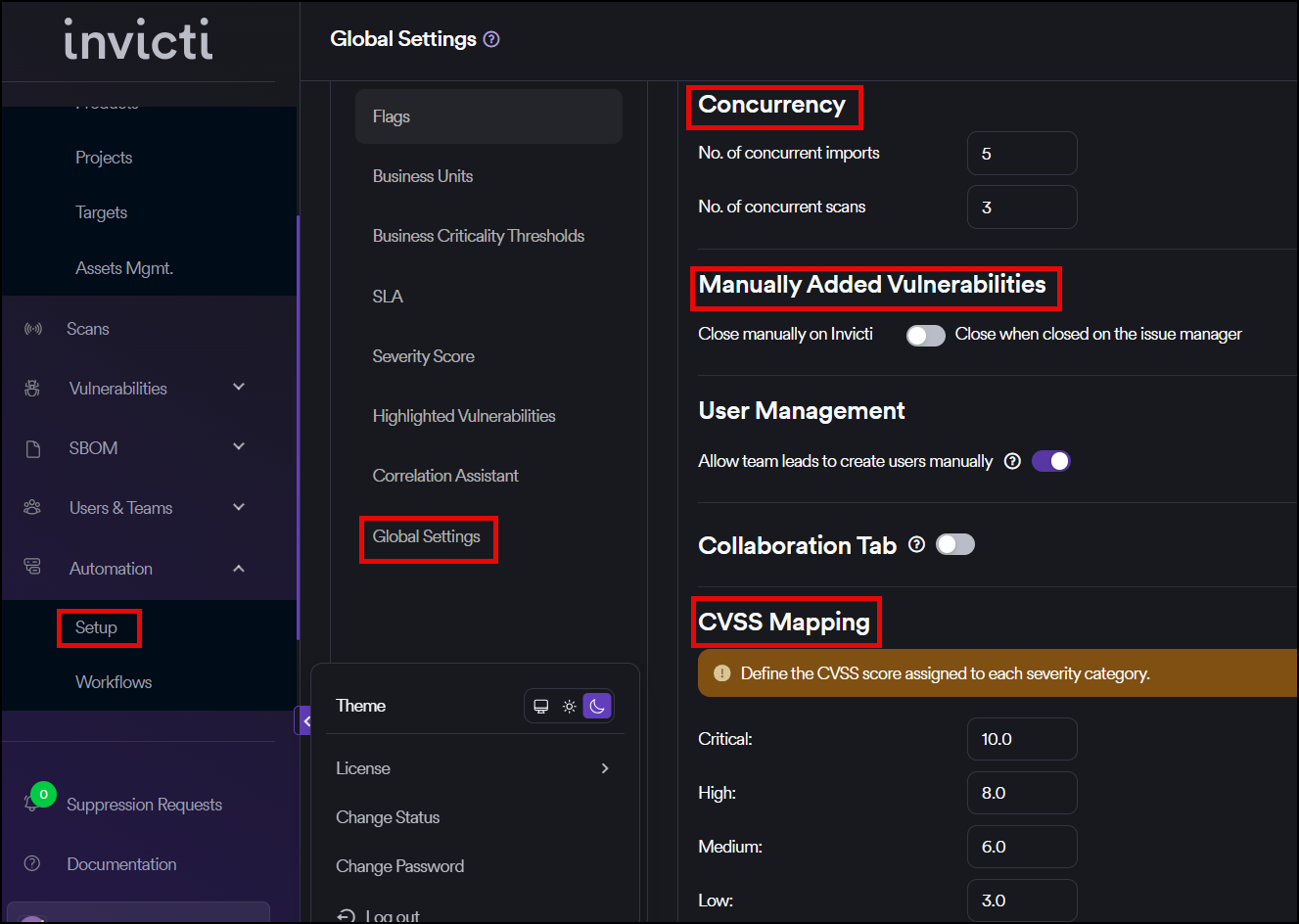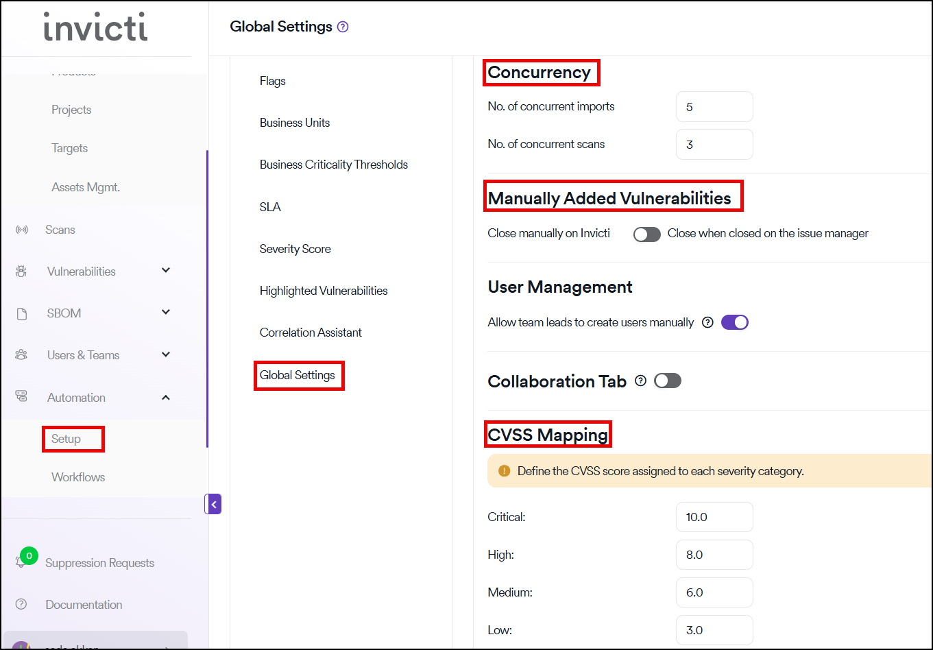 From this section, the assignment of CVSS scores to each severity category can be defined. The default CVSS scores are set by Invicti AppSec.