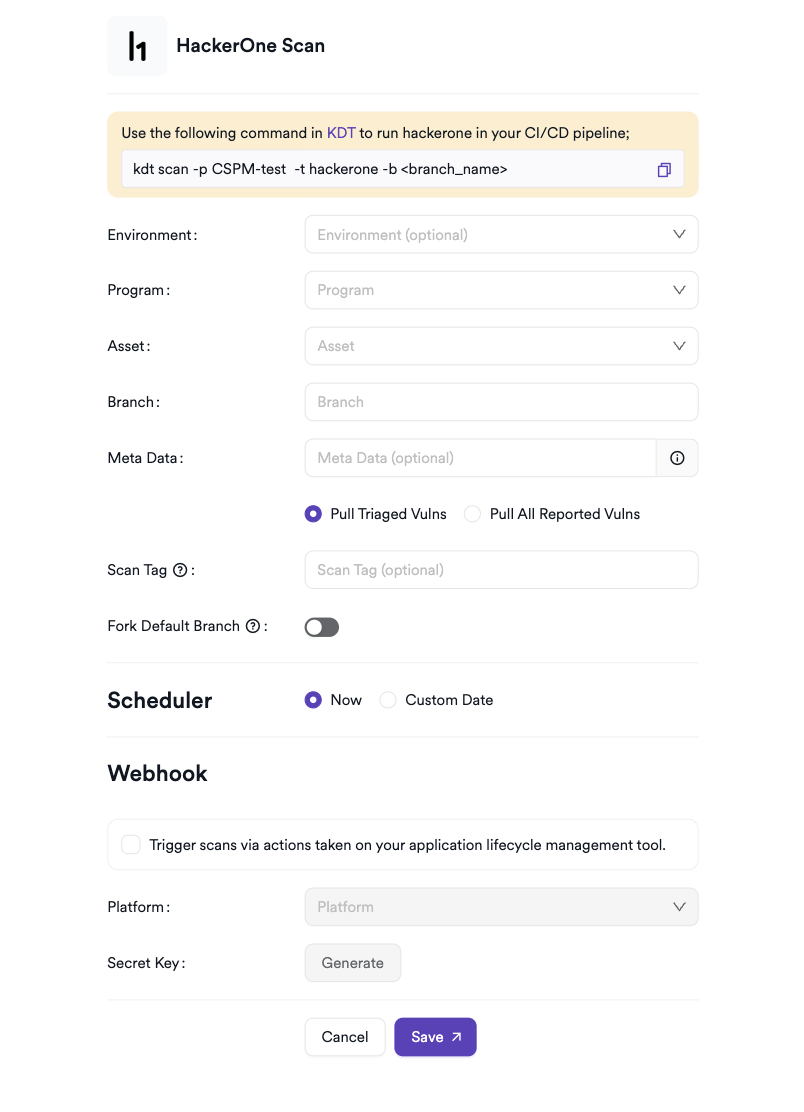 - HackerOne is a Bind-only integration — scans can't be triggered via the KDT CLI; reports must be pulled through the Invicti AppSec web interface or scheduler.
