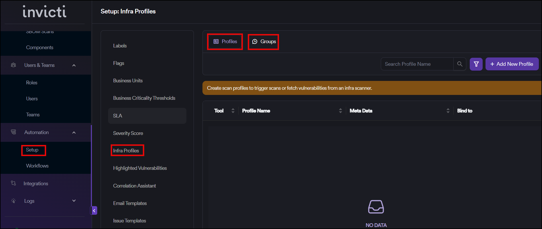 Infra scans are run at a global level in Invicti AppSec and vulnerabilities related to infra are associated with projects through the use of Infra Groups. Any infra scans that are intended for use in Invicti AppSec are integrated as an Infra Profile, a process which mirrors the Add Scanner section of projects.