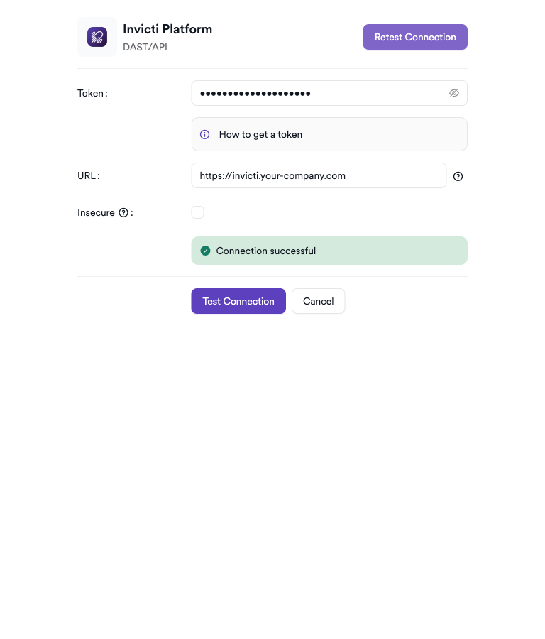 - Token: Paste the API token generated from your Invicti Platform account.