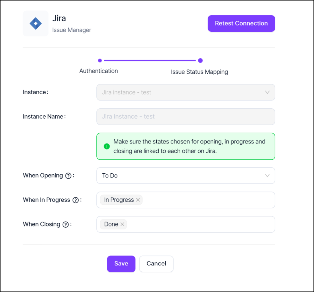 Make sure the states chosen for opening, in progress and closing are linked to each other on Jira so that Invicti AppSec can create tickets and change or track their status on Jira successfully. This global setting can be changed under project settings if a different configuration is needed on a project level. To ensure the correct configuration, the organization's workflow can be reviewed and directly integrated into this section.