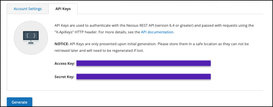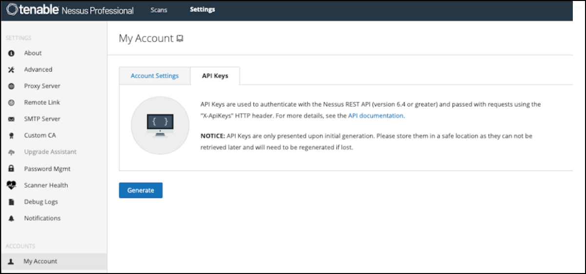 To enable integration, an API key must be generated for the Nessus Pro service account.