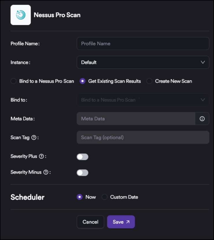 - Bind to a Nessus Pro scan: Profile-based scanning: An existing profile can be selected and used for active scanning