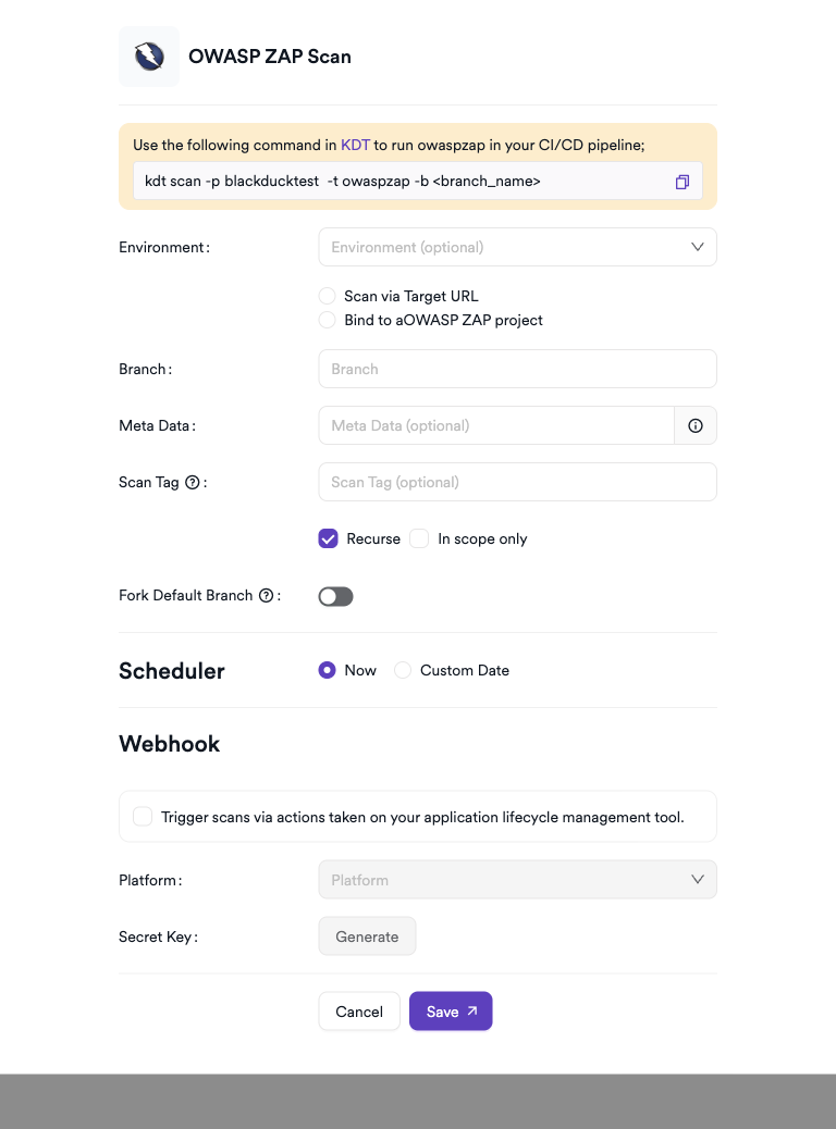 kdt scan -p <project_name> -t zap -b <branch_name>