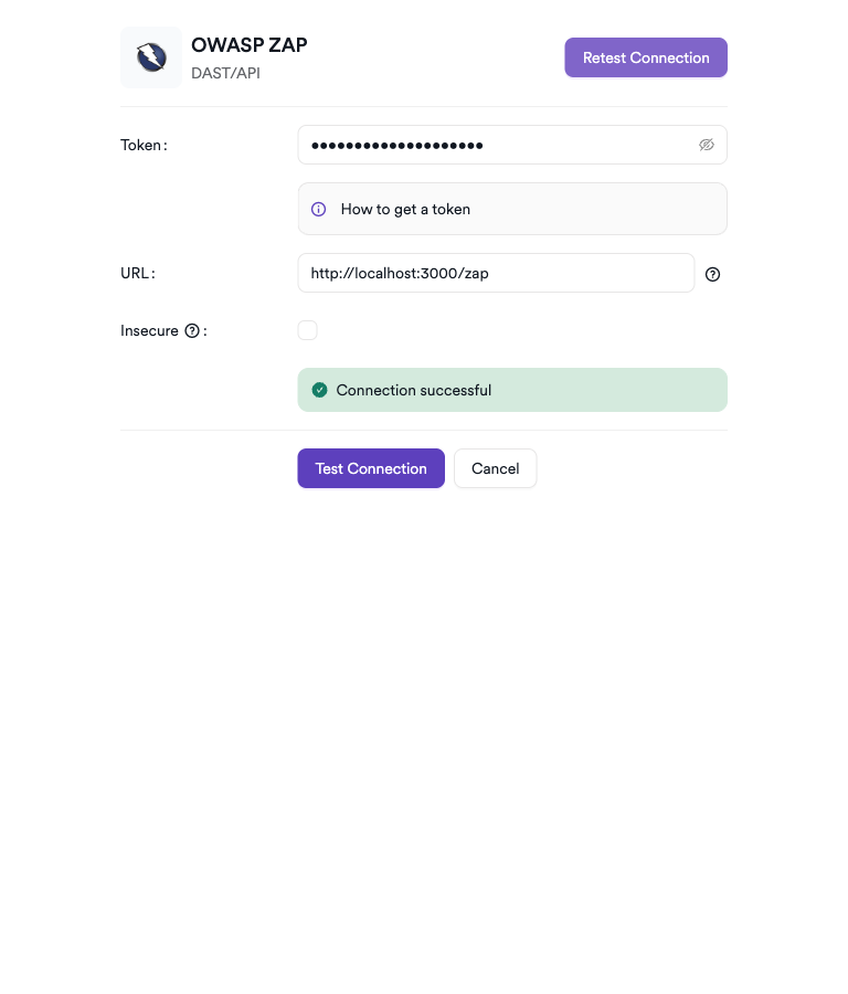 - Token: Paste the API token from your OWASP ZAP instance.
