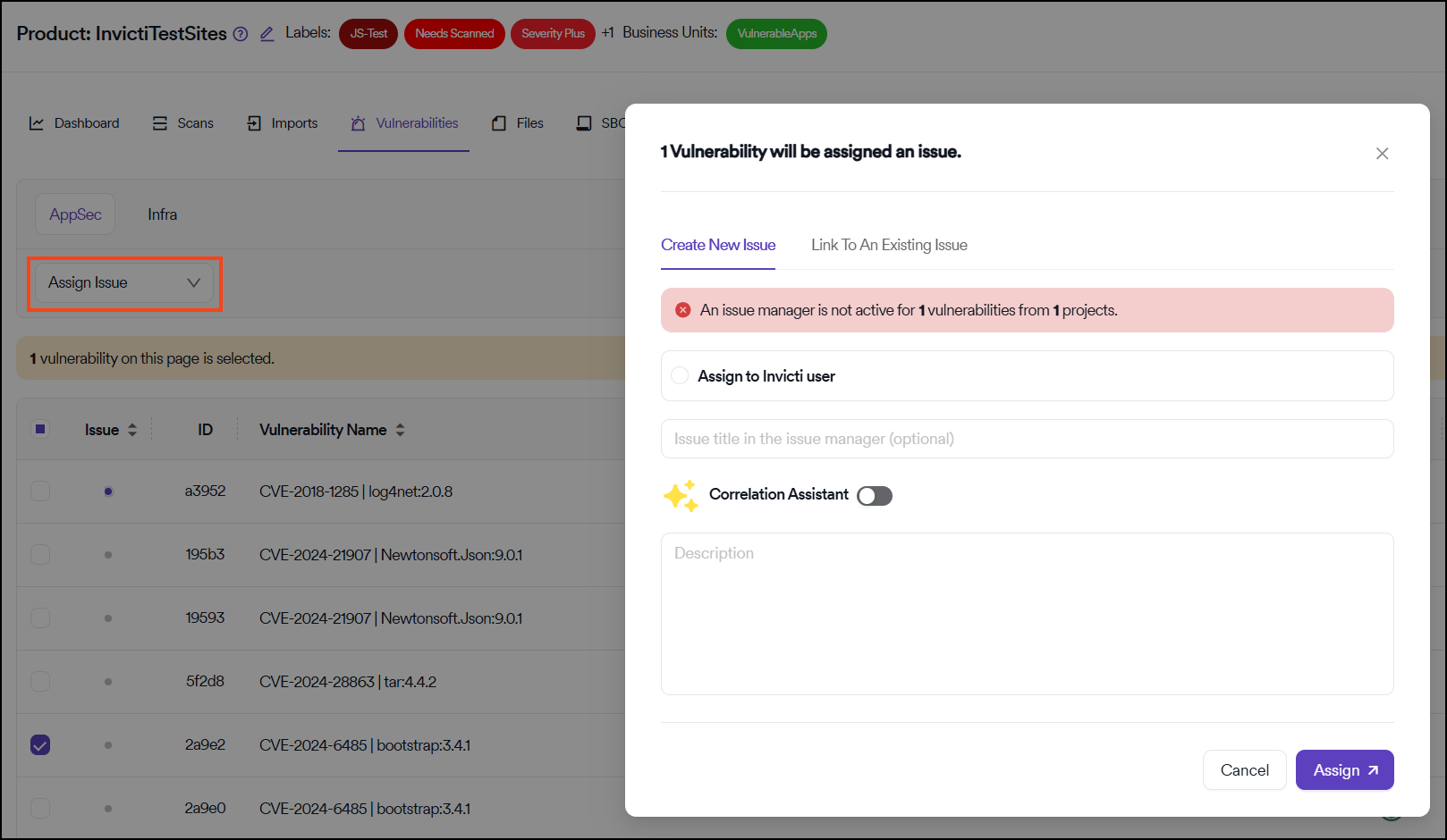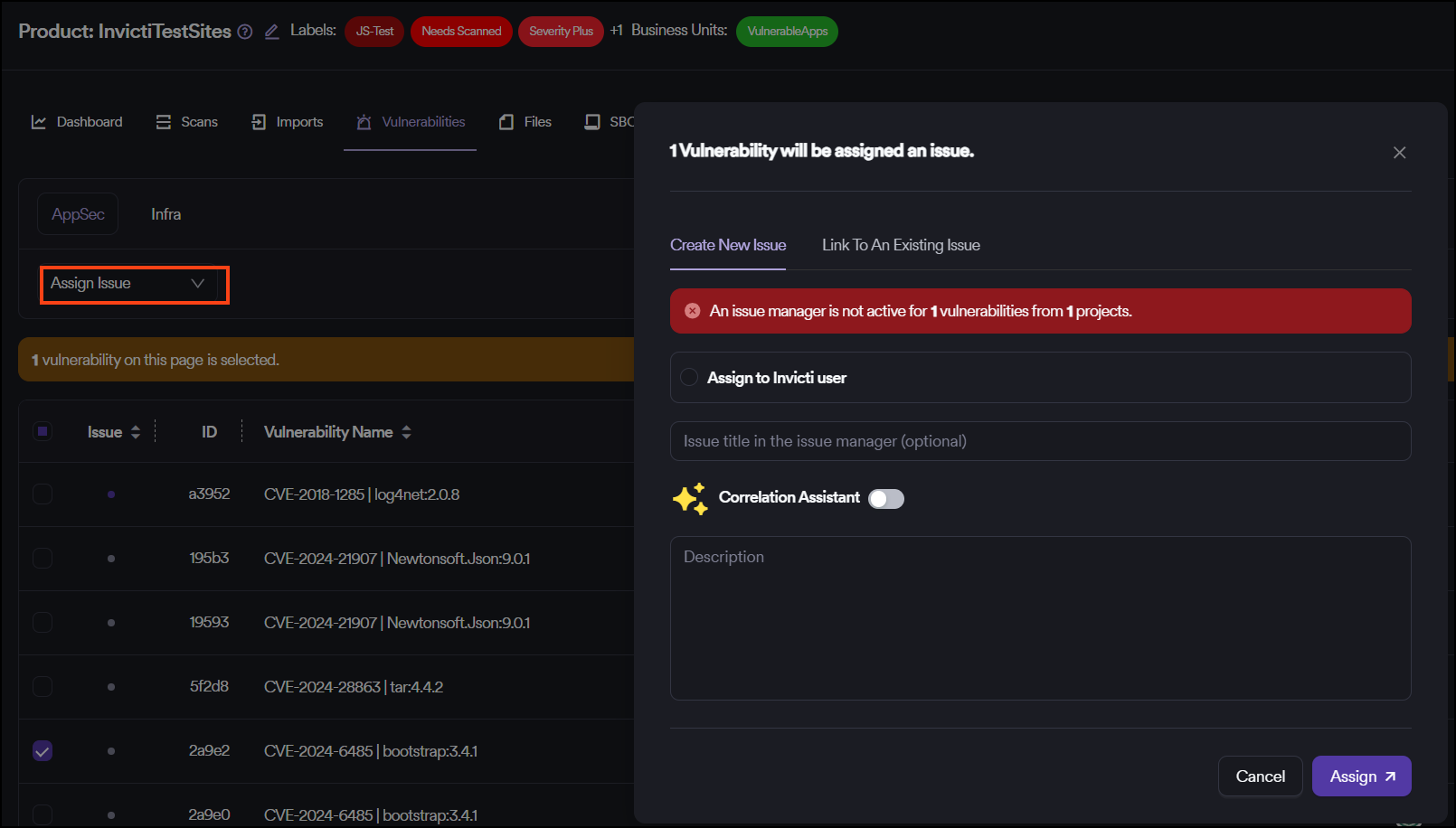 If the circle is already blue, selecting these vulnerabilities isn't possible when the Assign Issue bulk action is clicked.