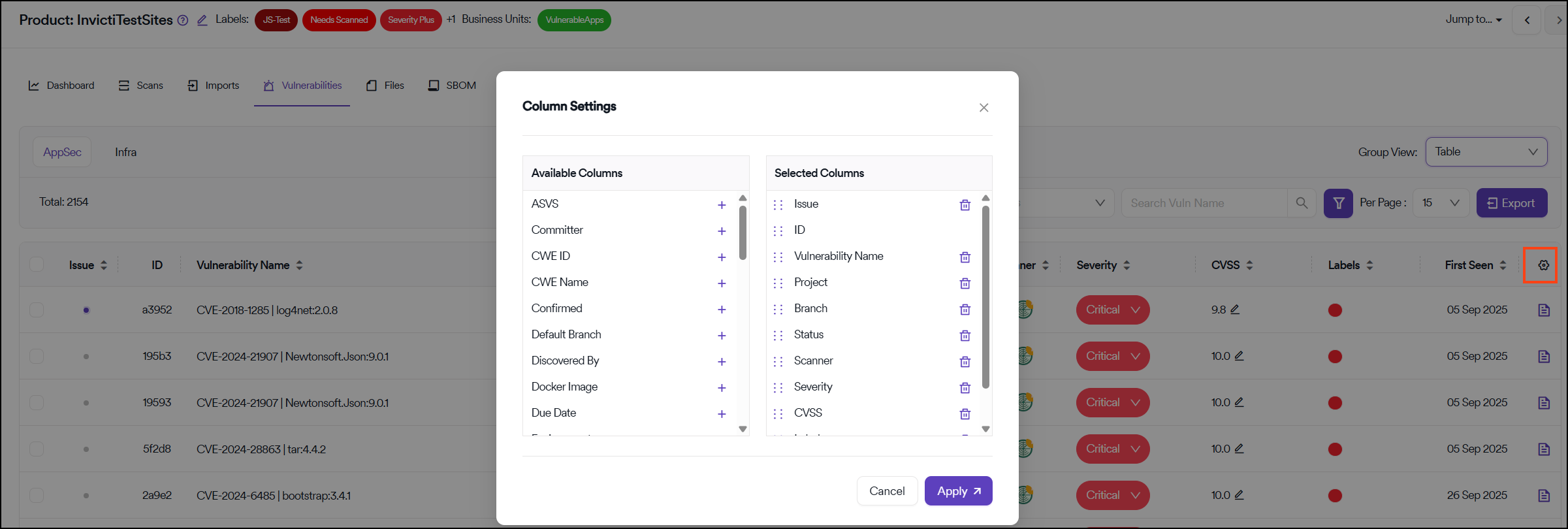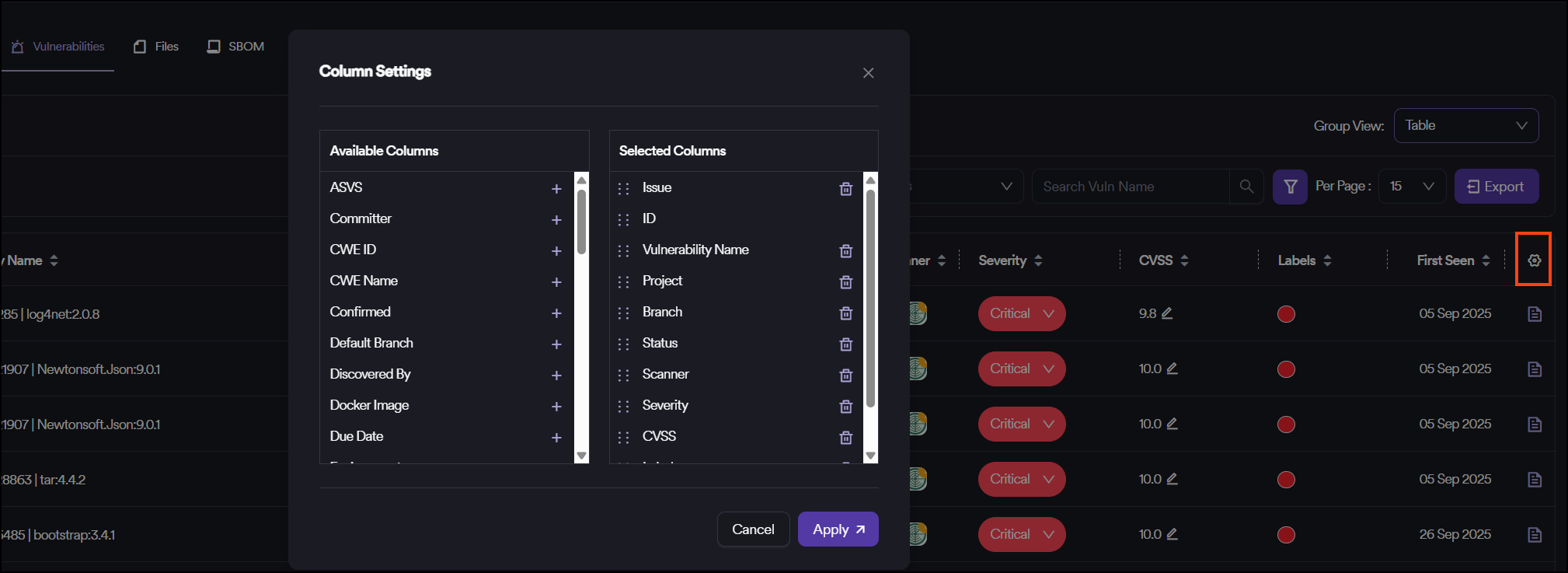 You can export vulnerabilities displayed on the table in CSV format by clicking the Export button in the top right corner. The columns available on the table can be changed by clicking the gear icon located in the top right corner of the table.