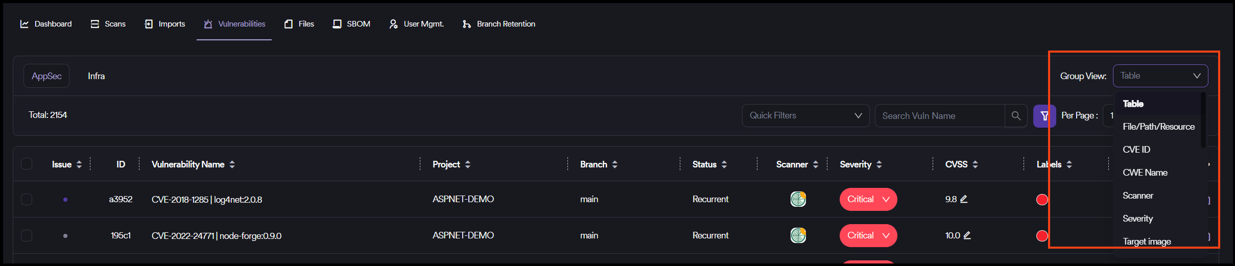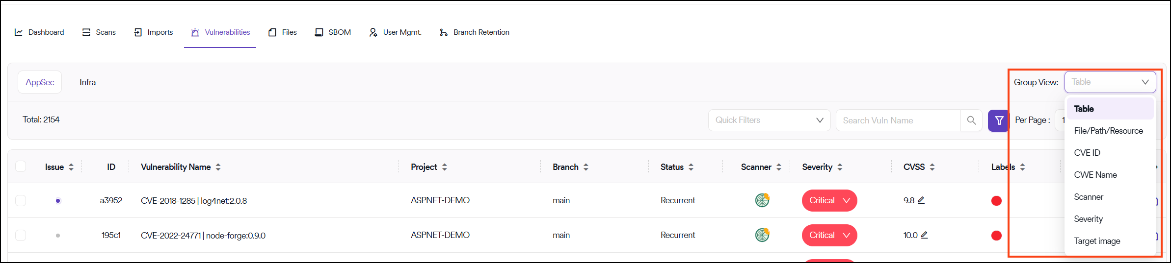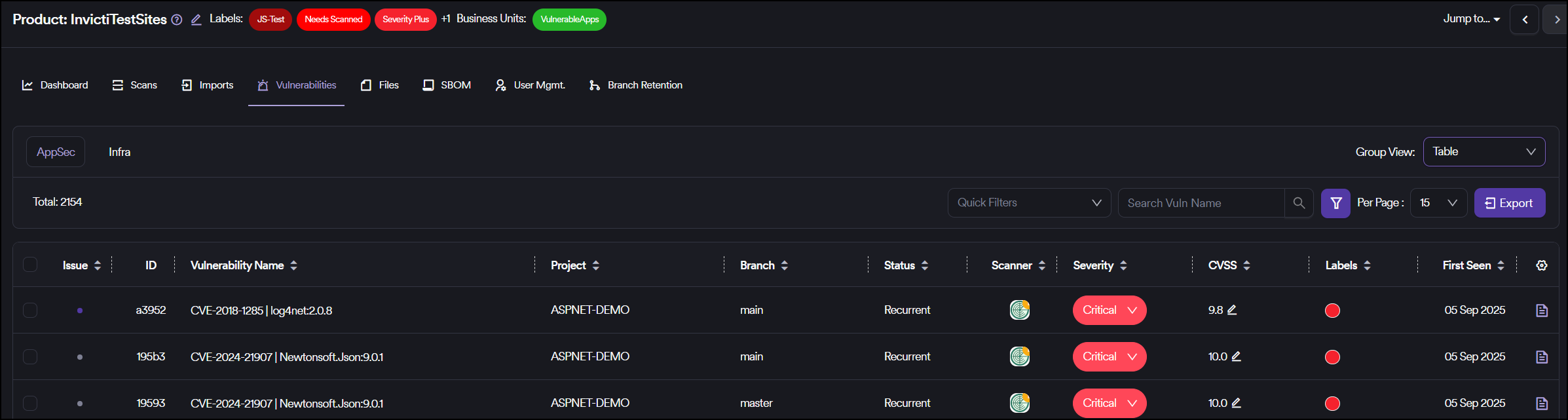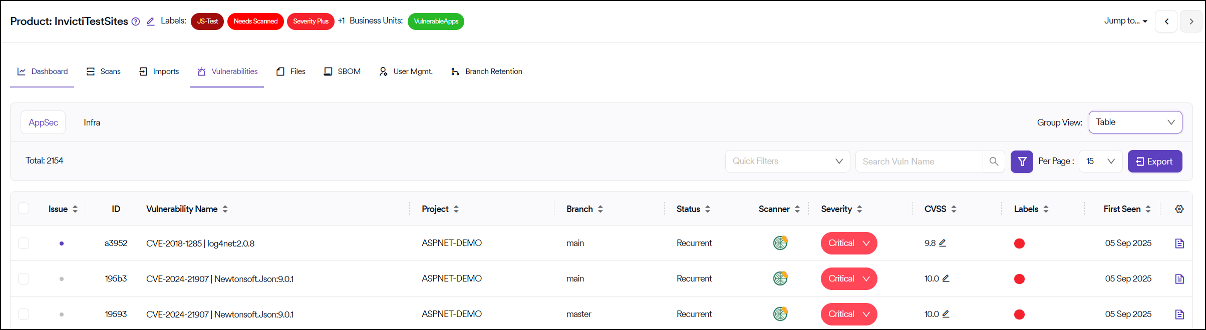 This is the screen where you can drill down into the details of vulnerabilities discovered in the scans performed on the projects under the selected product, take action on vulnerabilities, or export them.