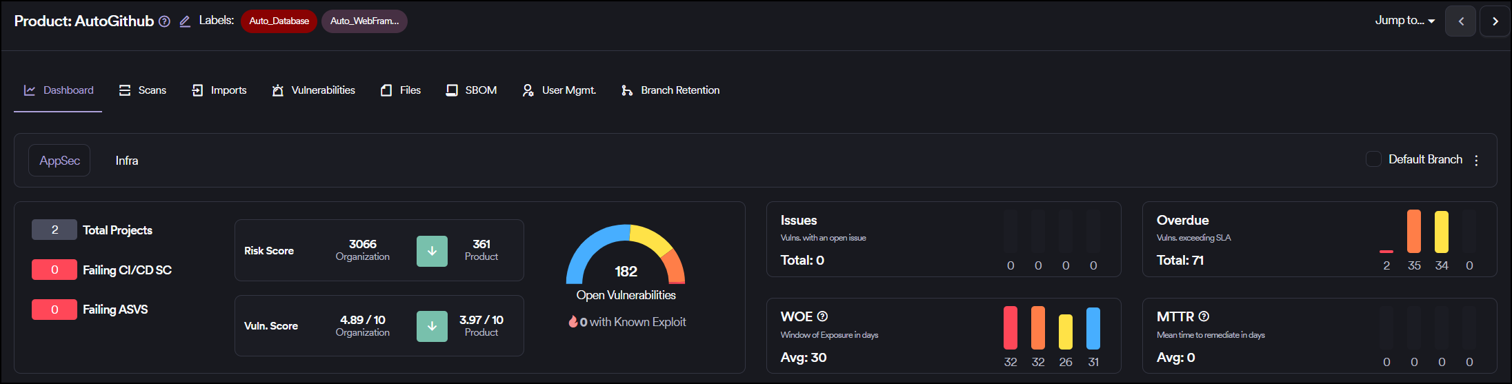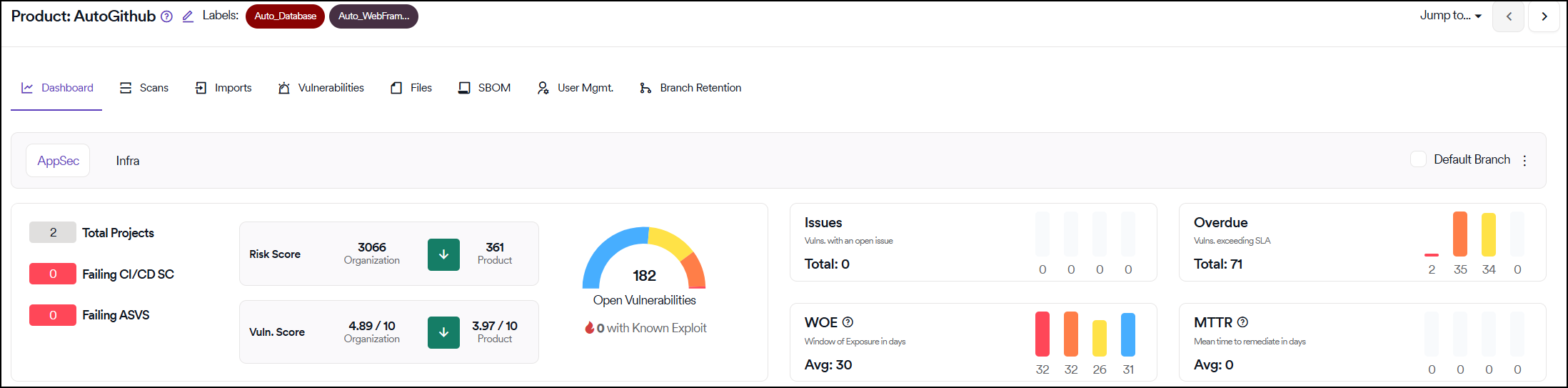 Product dashboard consists of vulnerabilities discovered in the projects placed under the selected product.