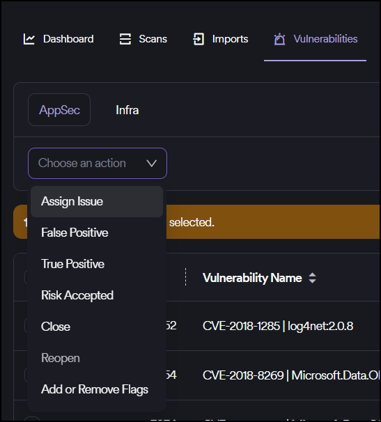 If an issue needs to be assigned for a single vulnerability or multiple vulnerabilities, you can use the checkboxes on the left-hand side of each row and click the Assign Issue button in the Choose an action dropdown menu that appears in the upper left corner.