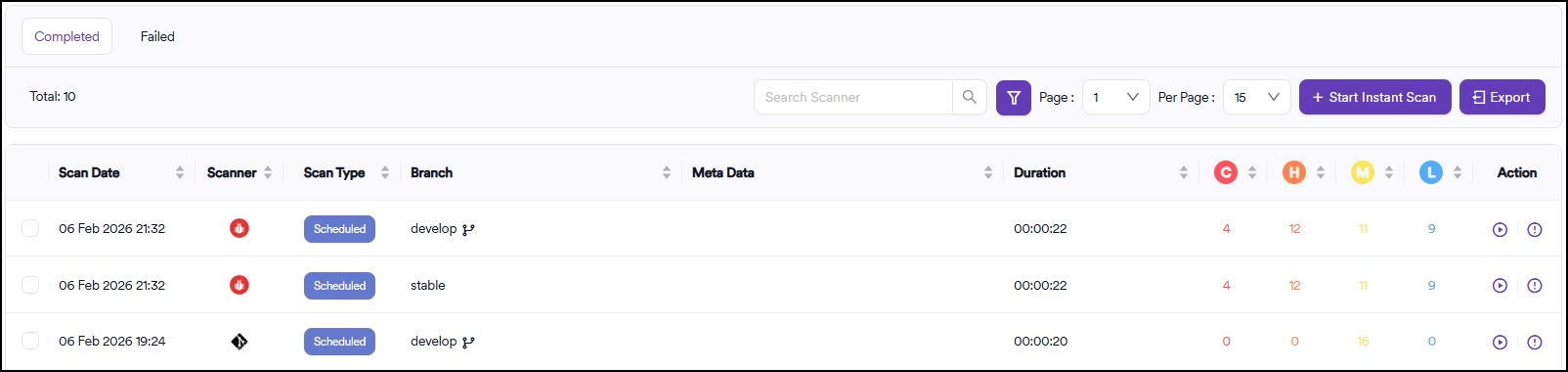 - Rescan: click the Rescan button in the Action column to re-execute a scan. This action is available for both completed and failed scans.