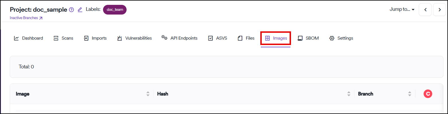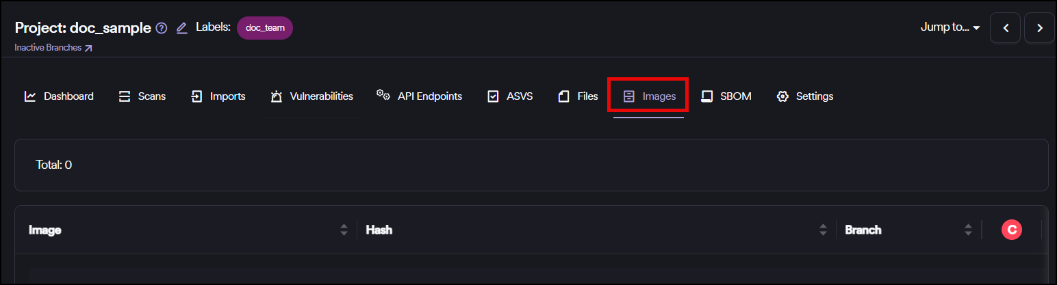 Vulnerable images discovered by a container security testing tool in a project appear in this section.